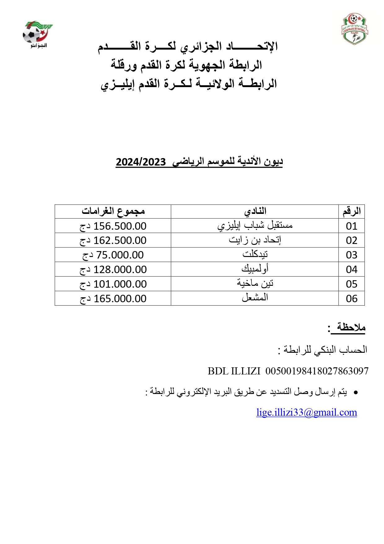 بناءً على المنشور رقم 29 المؤرخ في 17 سبتمبر 2024 المتعلق بتحصيل الغرامات والديون، تدعوا الرابطة الولائية لكرة القدم كل الاندية لتسوية الديون الخاصة خلال دفعات :