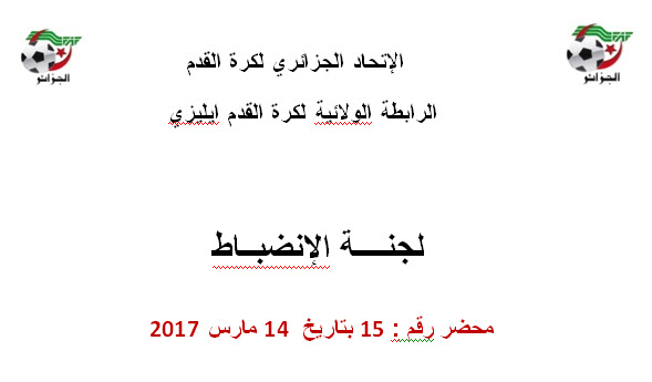 تعلم لجنة الإنضباط بالرابطة الولائية لكرة القدم بإيليزي جميع الفرق أنها أصدرت المحضر رقم 15 للإطلاع عليه يرجى الضغط على الرابط : النشرة الرسمية لجنة الإنضباط